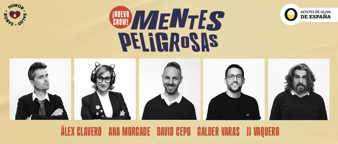 Nuevo show, nuevos monólogos y nuevos gags. Mentes Peligrosas vuelve para demostrar que es la mejor fiesta de la risa posible. Álex Clavero, Ana Morgade, David Cepo, Galder Varas y JJ Vaquero llegan al Auditorio El Batel para bailar, cenar, beber… y, sobre todo, reírnos como nunca.
