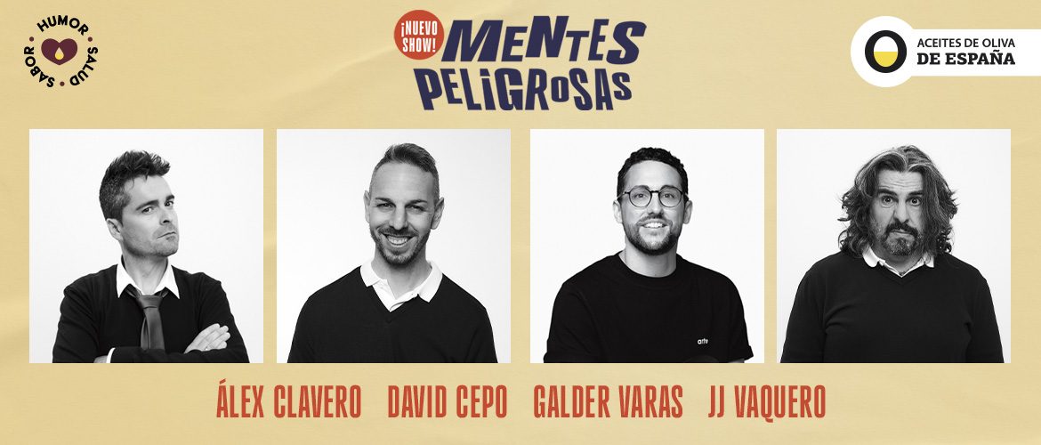 Nuevo show, nuevos monólogos y nuevos gags. Mentes Peligrosas vuelve para demostrar que es la mejor fiesta de la risa posible. Álex Clavero, David Cepo, Galder Varas y JJ Vaquero llegan al Auditorio El Batel para bailar, cenar, beber… y, sobre todo, reírnos como nunca.