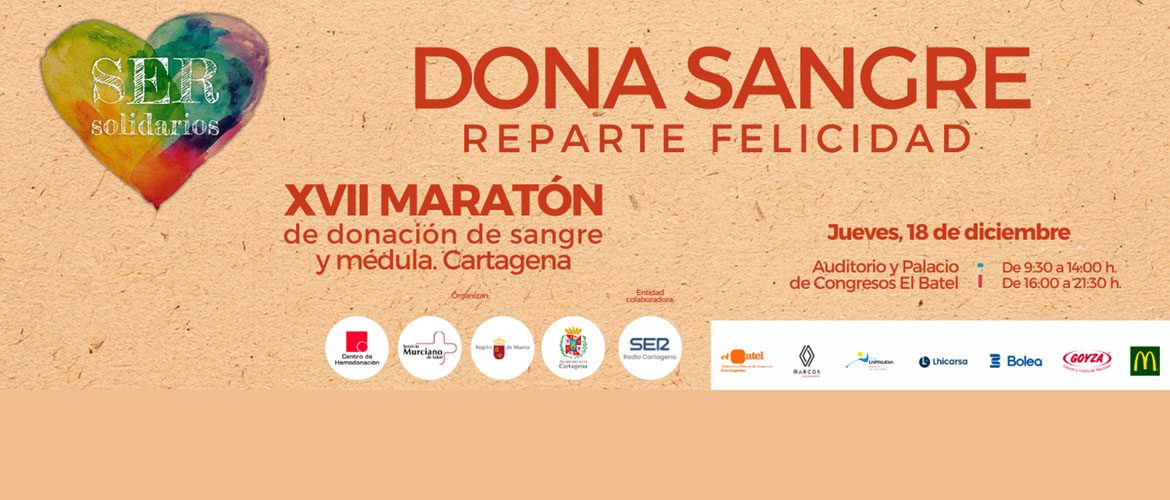 El maratón de donación de sangre SER Solidarios se lleva a cabo con la colaboración del Ayuntamiento de Cartagena, el Palacio de Congresos y Auditorio El Batel, Cartagena Puerto de Culturas, Renault Marcos Automoción, Lhicarsa, Mecánicas Bolea y Goyza - Cestas y lotes de Navidad.